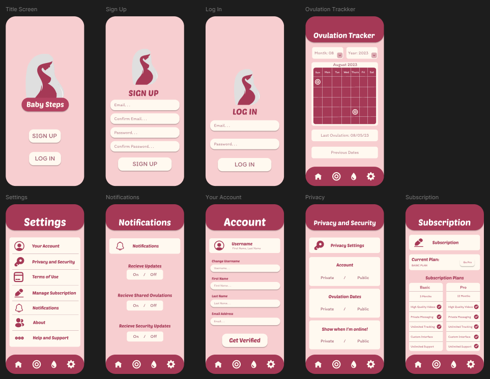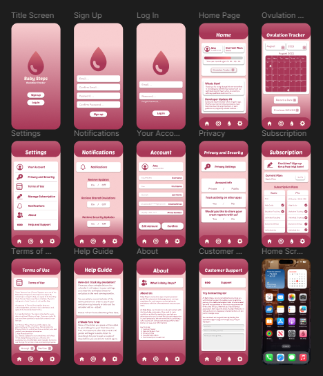 Overall, I was able to showcase my ability to make a seamless experience for the user. My design process included exploring different layouts for navigation and ensuring consistency across all screens, from the title page to more detailed sections like notifications, settings, and subscription management. I also paid close attention to usability, making sure that information such as ovulation cycles, account details, and support resources were easy to access and understand.