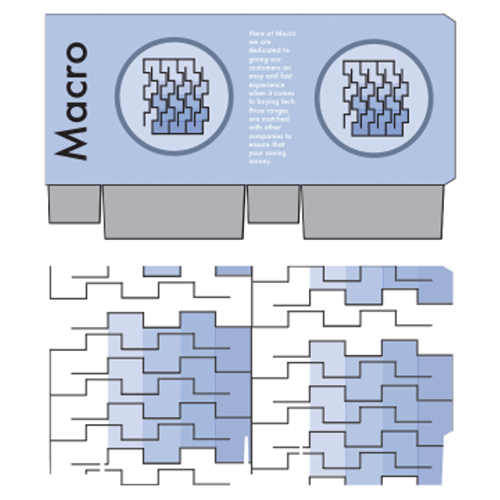 After more revisions the packaging is aimed to loosely imitate the design of hardware elements such as computer chips', data lines, and more, which are more familiar to those who work with computers. I named the company Macro Intel Systems because I wanted the name to demonstrate that this 'fake' company I made up specifically deals with technology.